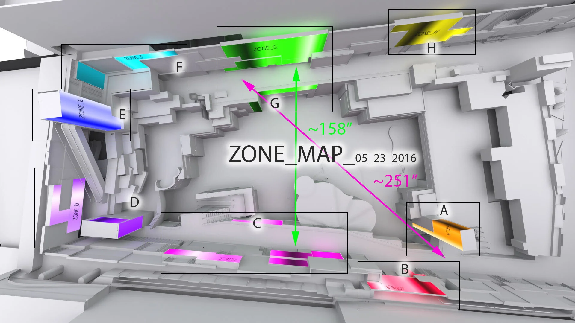 Prior to on-site integration we reviewed the design treatments in VR. We used VR to evaluate the user experience from different POVs throughout the Spectacle and to help us understand high foot traffic areas prior to on-site integration.